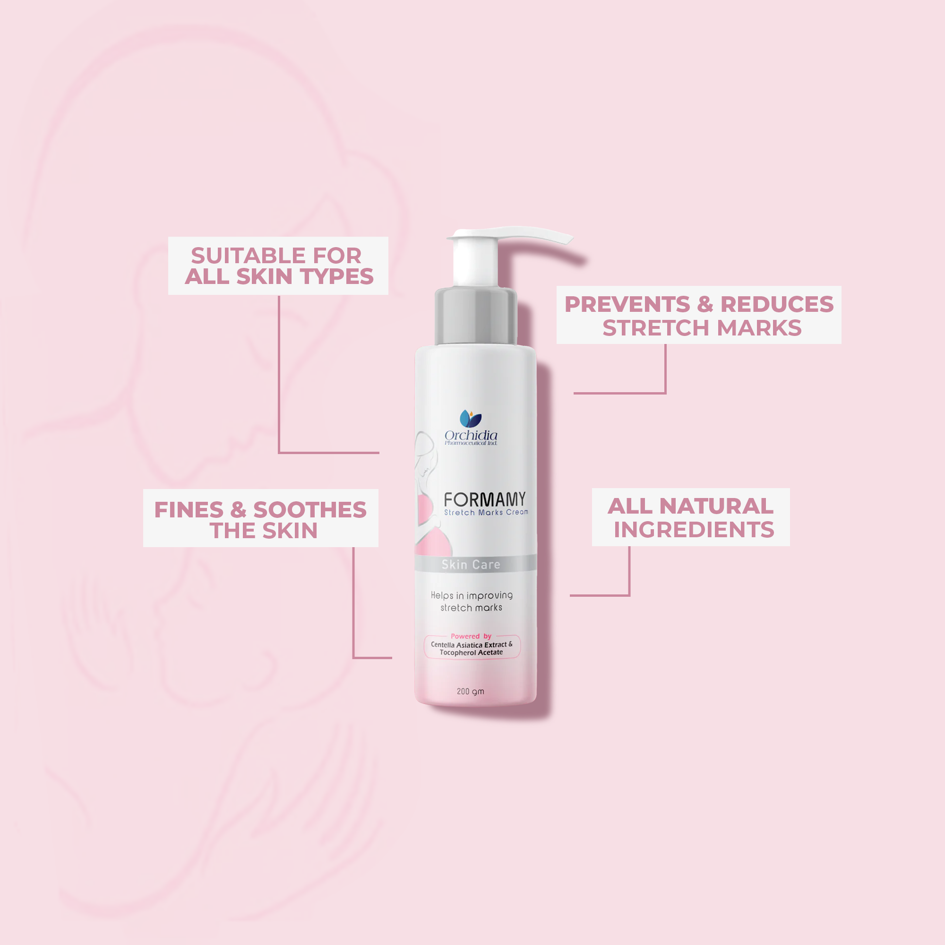 كريم فور مامى بمكوناته العضوية و الطبيعية هيخلصك من علامات التمدد البيضاء و الحمراء و كمان هيمنع ظهورها. تركيبته خفيفة و لطيفة و آمنة لأنه غنى بزبدة الشيا و الكولاچين و الزيوت الطبيعية اللى بيعملوا على شد البشرة و تهدئتها. مكوناته الطبيعية بتخليه مناسب لجميع أنواع البشرة.