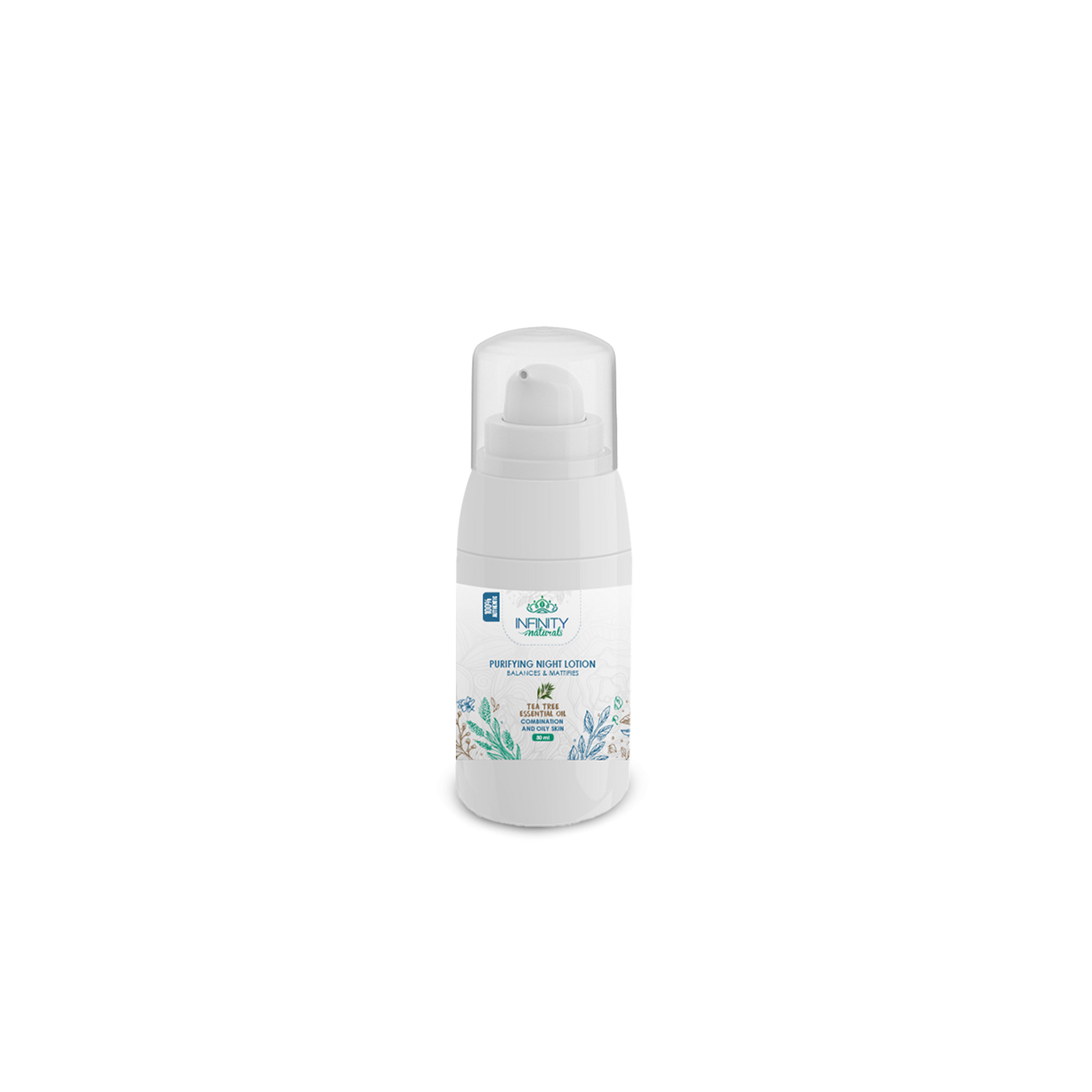 Infinity's Naturals Purifying Night Lotion is specially formulated to provide moisture and balance to the skin. Infused with Tea Tree Essential Oil and jojoba Oil, this lotion is ideal for normal to combination skin types. Its lightweight formula ensures a comfortable and non-greasy feel. By moisturizing the skin, it helps maintain optimal hydration while effectively absorbing excess oil. that will leave your skin refreshed and balanced ,feeling nourished and revitalized.