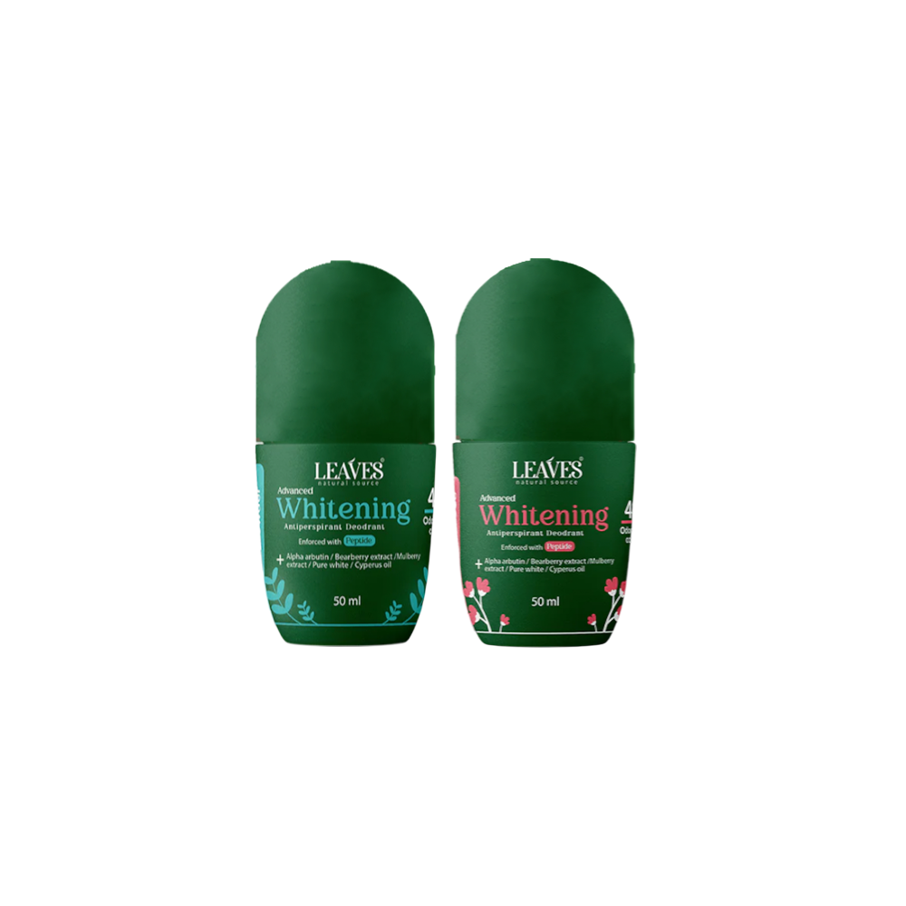 Enjoy double the freshness and brightening with the Advanced Whitening Antiperspirant Deodorant Box from Leaves. Powered by alpha arbutin, bearberry, and mulberry extracts, it helps even skin tone while providing 48-hour odor protection. The lightweight, non-sticky formula absorbs quickly, slows hair regrowth with peptides and cypress oil, and remains gentle on sensitive skin. Each box includes two deodorants with different scents.