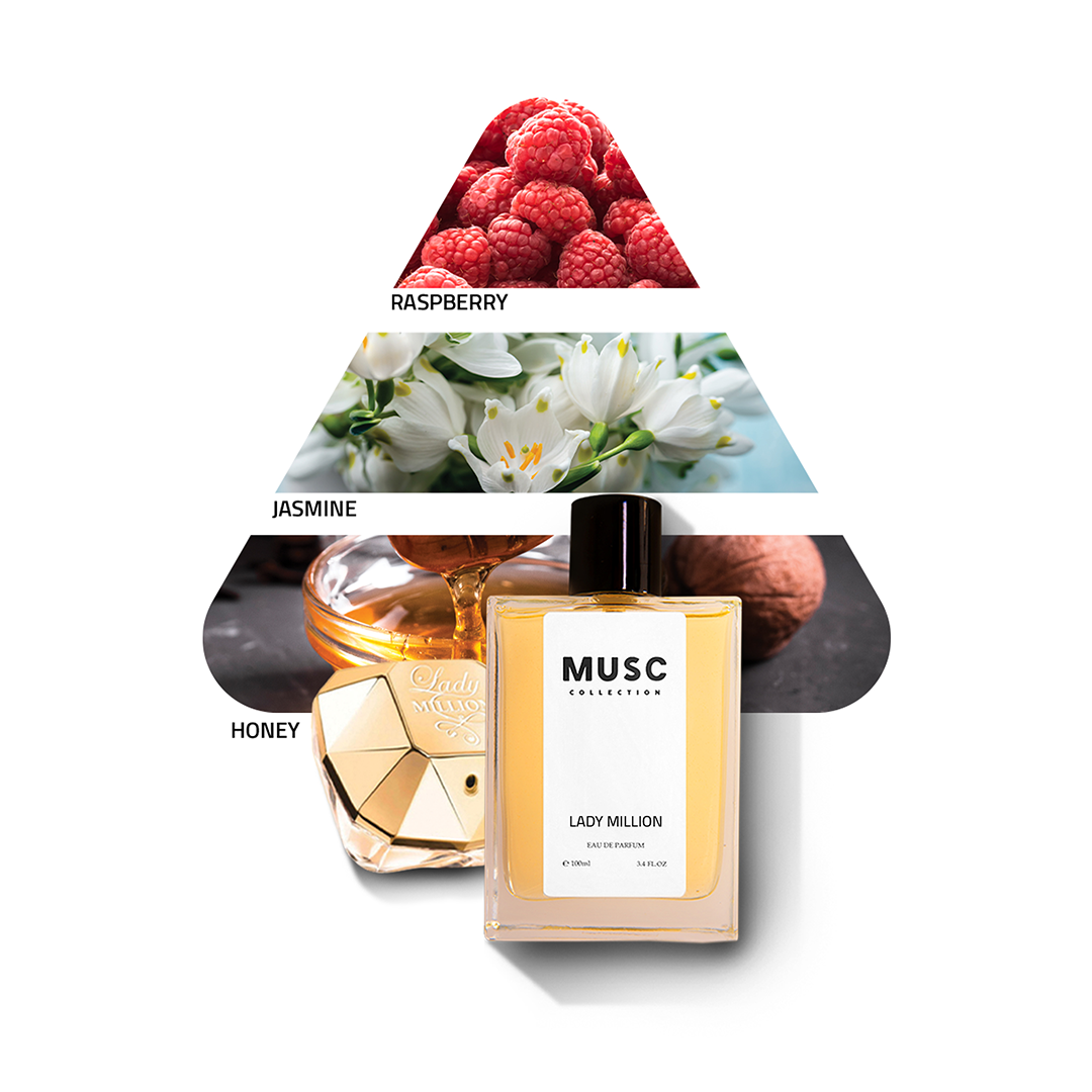 Radiant and captivating, Lady Million Musc Perfume celebrates the allure of femininity. Inspired by Lady Million, it opens with sparkling raspberry, neroli, and Amalfi lemon. A floral heart of jasmine, African orange flower, and gardenia flows into a warm, lasting base of white honey, patchouli, and amber.