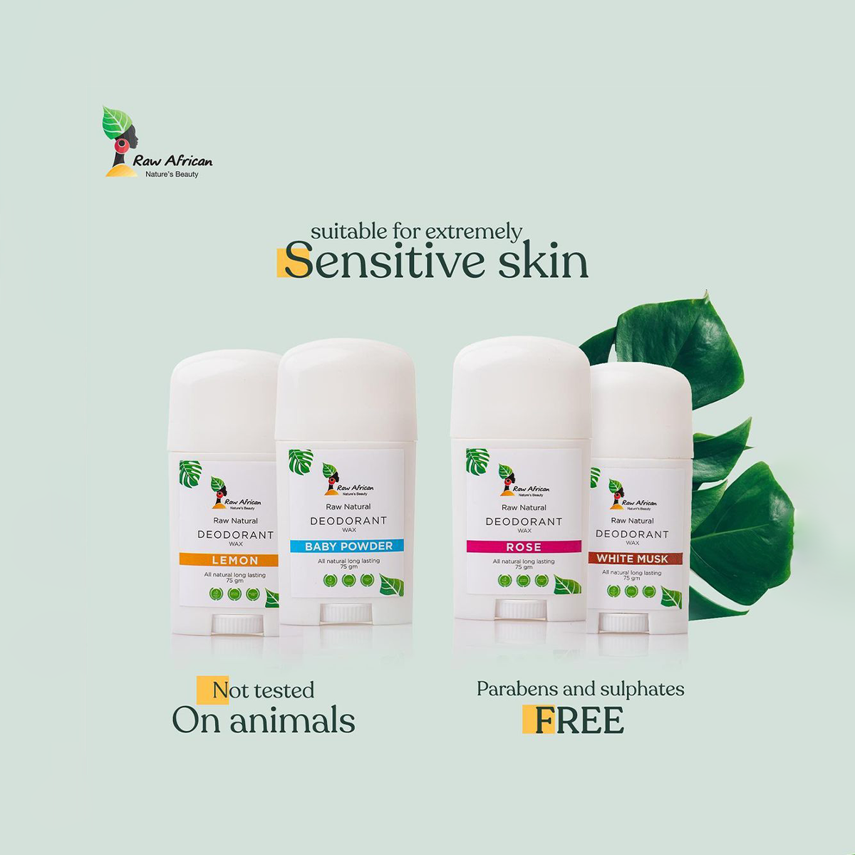 Prevent sweat and odor with this Raw African Baby Powder Deodorant. This 100% natural deodorant is free from aluminum and harsh chemicals that clogs pores. The gentle formula will work seamlessly and ensure your left fresh all day long.