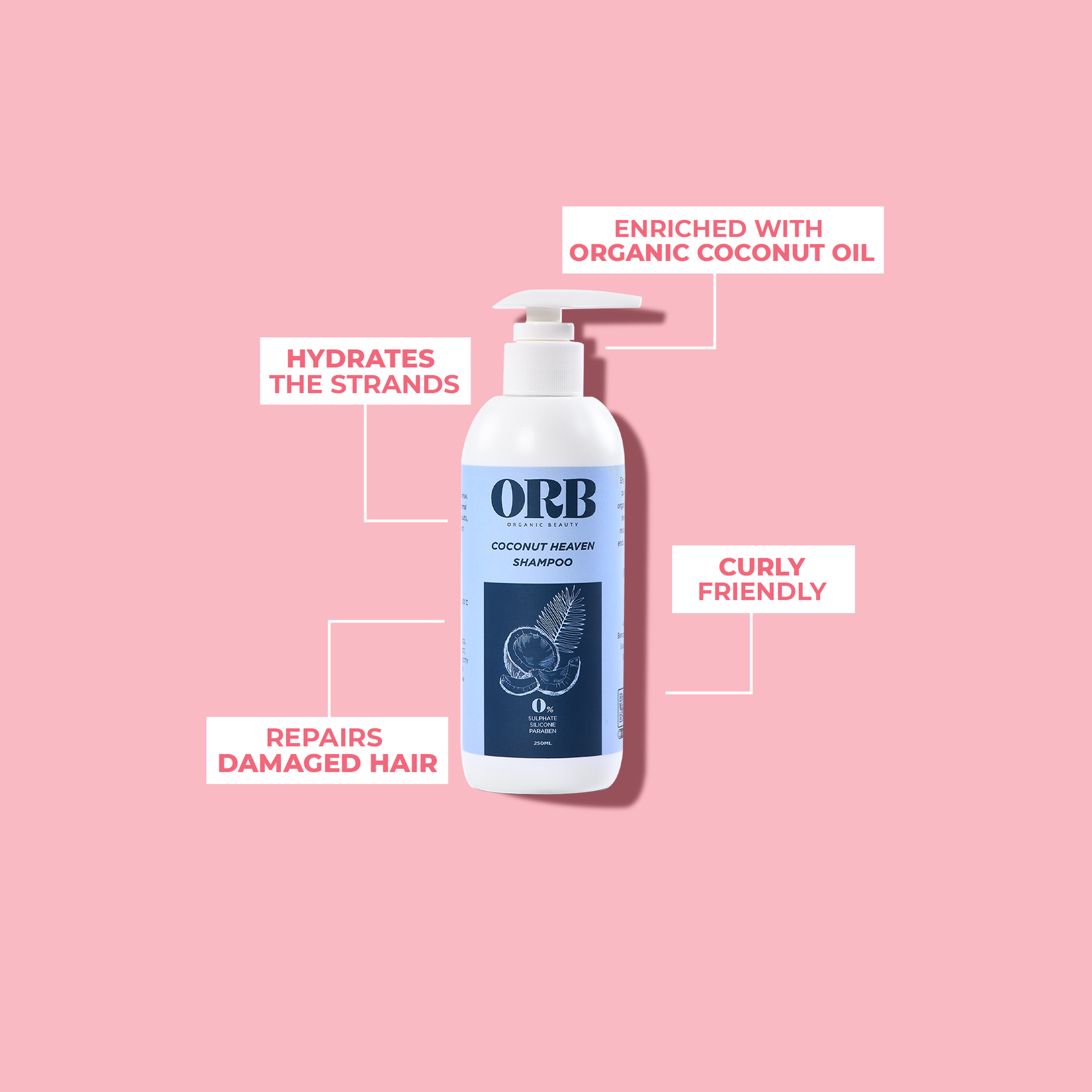 Experience the tropical bliss of ORB's Coconut Heaven Shampoo. Powered by nourishing coconut oil extract, it hydrates and seals split ends for shiny, bouncy hair. Packed with vital nutrients, it restores moisture and strength to dry strands. Repair damage, eliminate frizz, and enjoy deep moisture for beautifully bouncy locks. This curl-friendly, 100% vegan formula is best paired with the Coconut Heaven Conditioner.