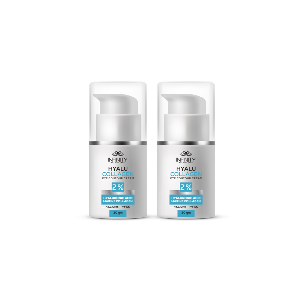 Infinity's Hyalu Collagen Eye Contour is specifically designed to nourish and hydrate the delicate skin around the eyes. It provides intense moisture to alleviate dryness in that area. Additionally, it has a brightening effect that helps diminish the appearance of dark circles and puffiness, resulting in a more vibrant and revitalized eye area.