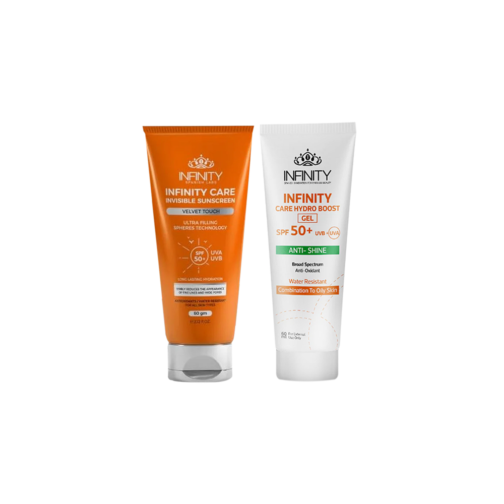 This power duo — Invisible Velvet Touch SPF 50+ + Infinity Care Hydro Boost Gel SPF 50+ by Infinity Pharma — combines sun protection with hydration for all-day skin comfort. Ideal for layering or using separately depending on your skin’s needs.