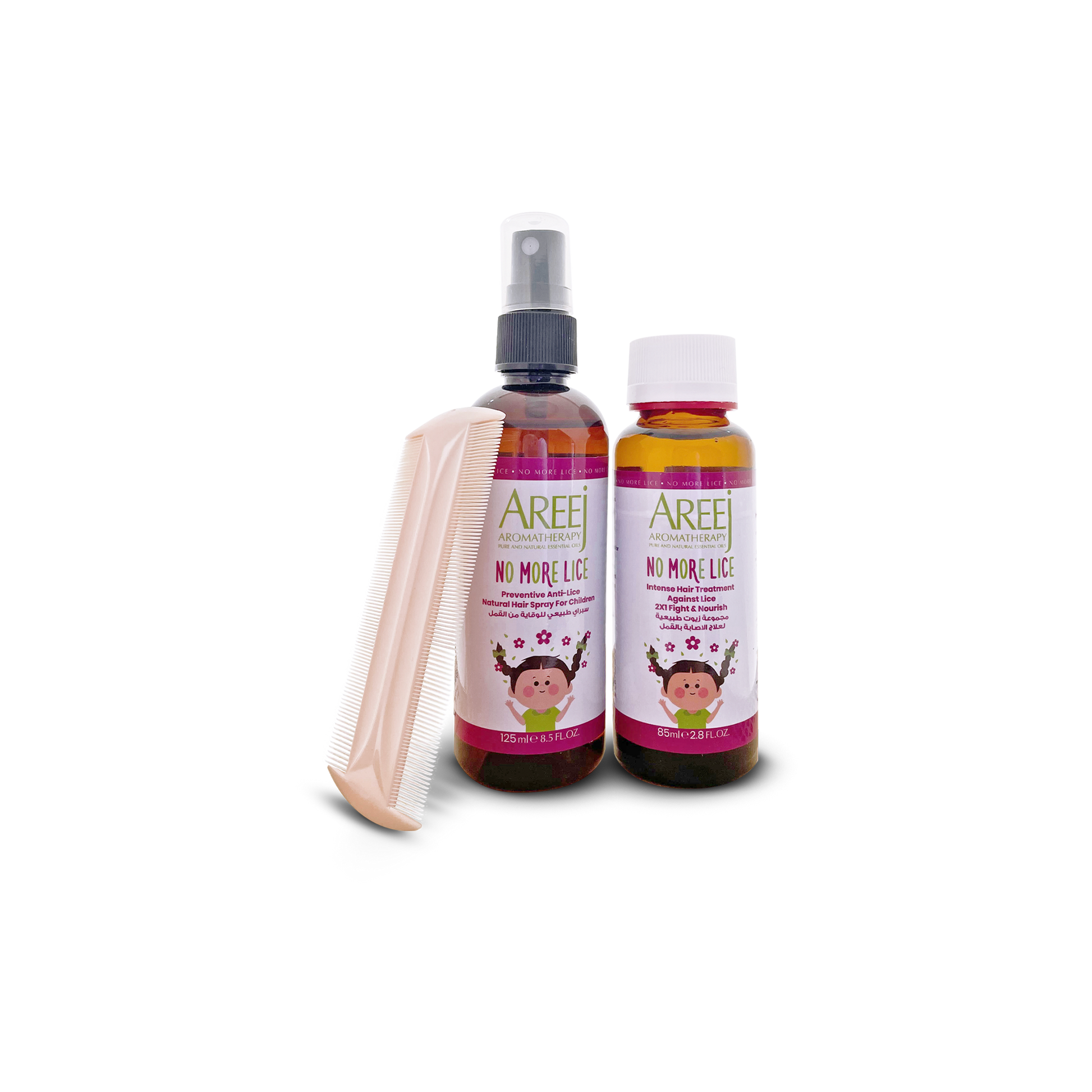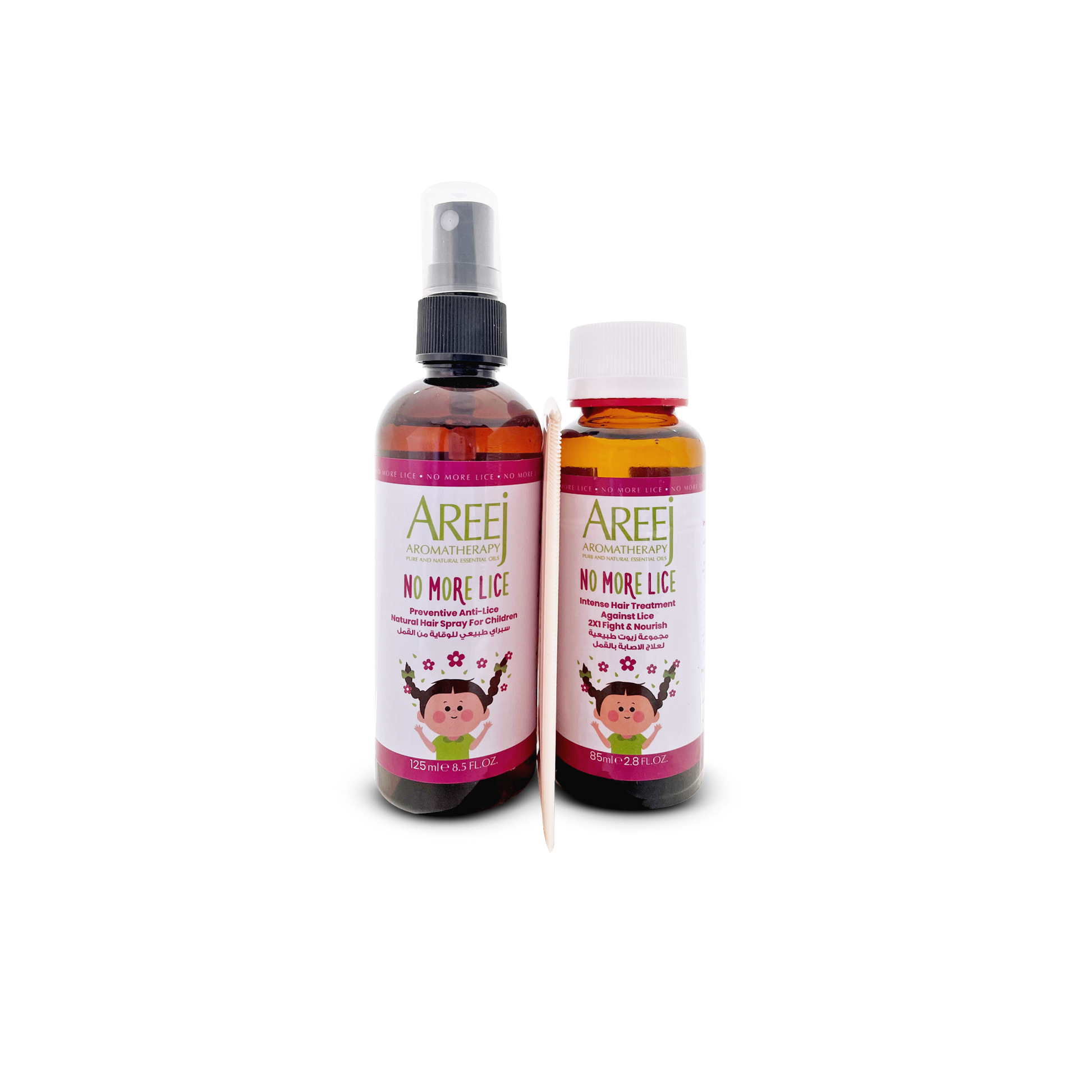 Introducing "2×1 Fight & Nourish," a lightweight hair treatment formulated with 100% pure and natural essential oils like Geranium and Tea Tree. This powerful formula fights against lice while nourishing your child's hair.