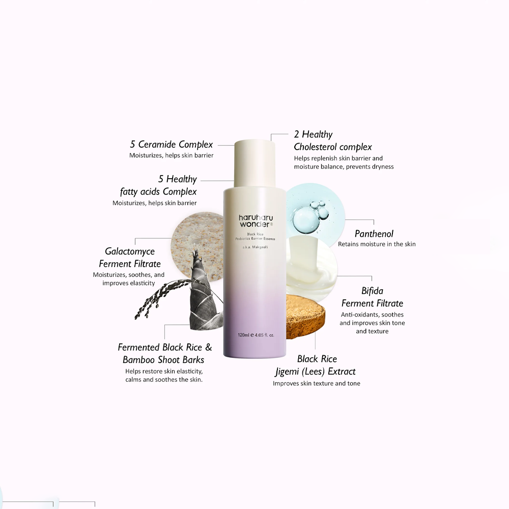 Formulated with a powerful blend of five Ceramides and a Fatty Acids Complex, the Black Rice Probiotics Barrier Essence strengthens the skin barrier while providing deep hydration. Infused with phytosterols, cholesterol, and galactomyces ferment filtrate, it improves elasticity and restores balance. Antioxidant-rich black rice lees extract soothes and protects, leaving skin plump, smooth, and comfortably nourished.