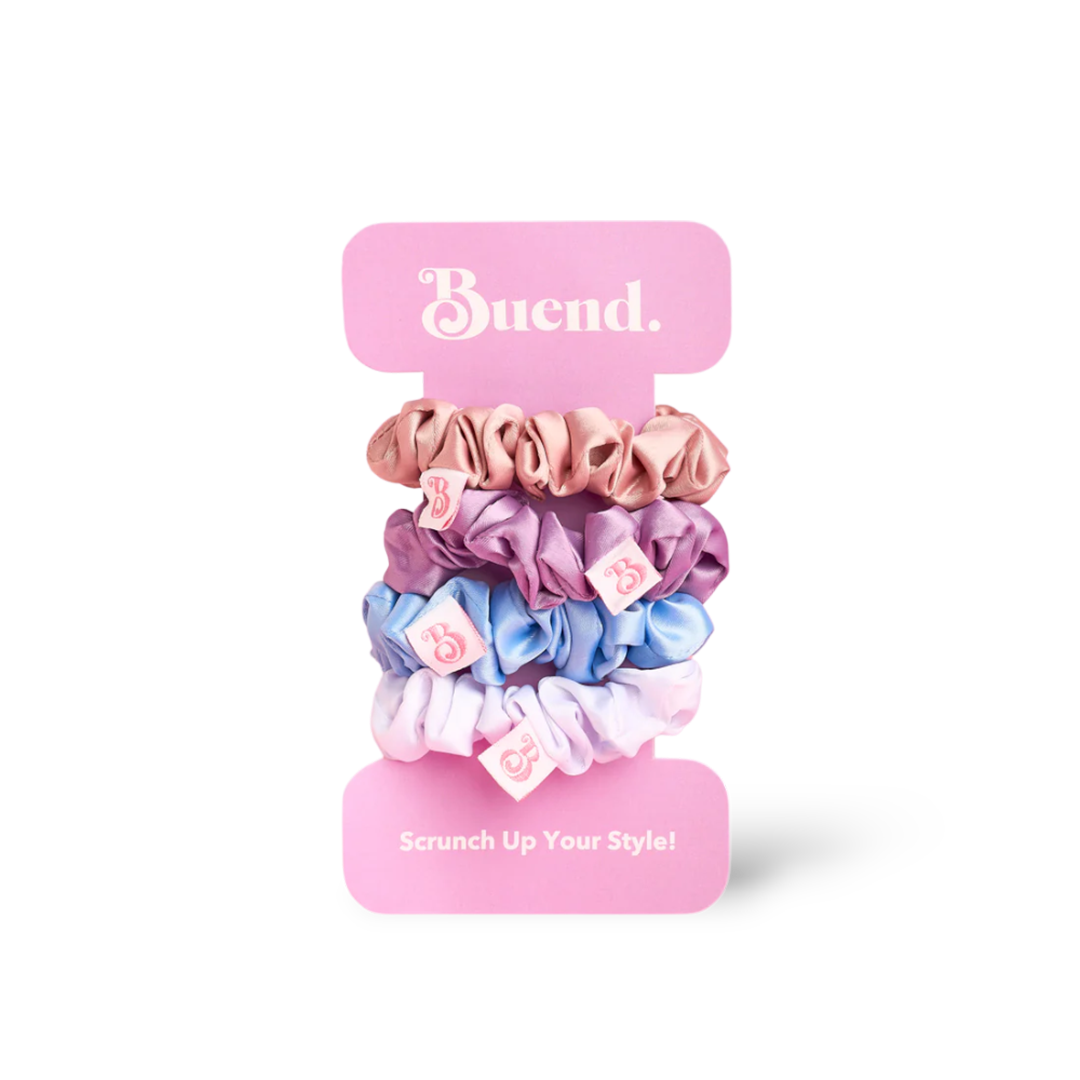 Add a pop of color to your hair with the Mini Scrunchies set from Buend, made from 100% silk for a soft, anti-frizz hold. The set of 4 offers a variety of vibrant options, ensuring your hair stays smooth and stylish without any damage. Perfect for elevating any look, these scrunchies combine comfort and flair.