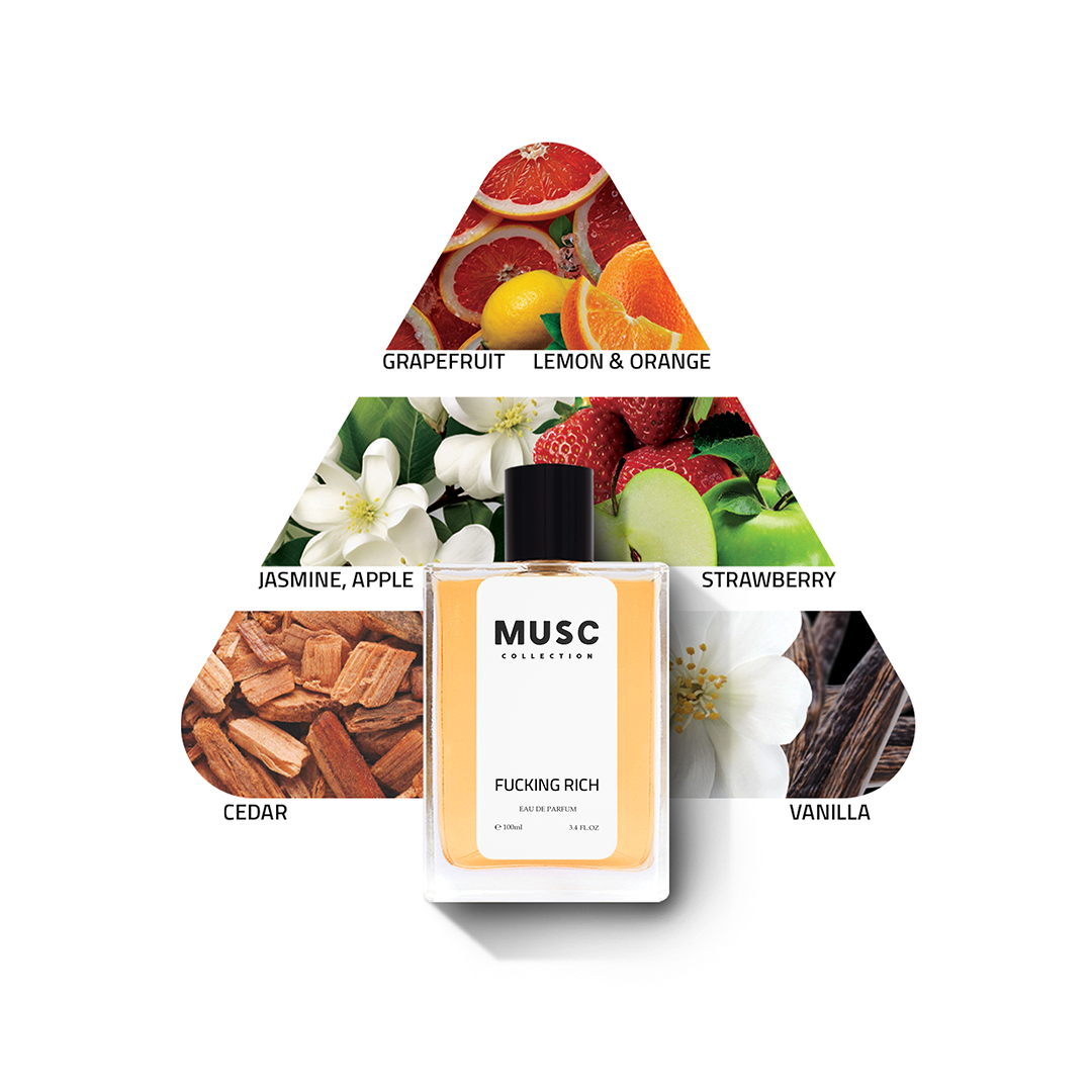 Bold and playful, Fucking Rich Perfume captures a vibrant energy with zesty top notes of grapefruit, tangerine, lemon, and orange. A juicy floral-fruity heart of jasmine, apple, strawberry, rose, and peach adds sweetness, while a warm base of white musk, cashmeran, cedar, vanilla, and caramel leaves a lingering, confident trail.