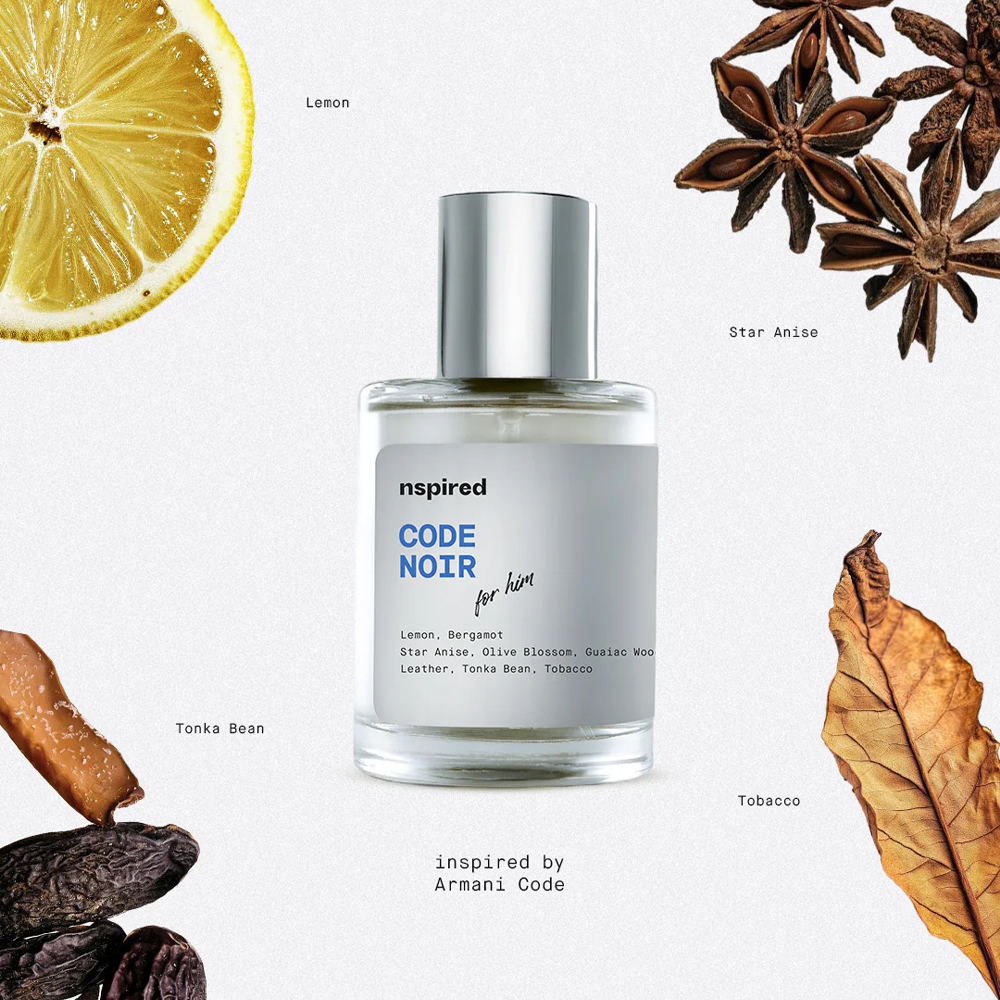 Unleash your allure with Code Noir—a magnetic fragrance inspired by Armani Code. It begins with a zesty burst of lemon and bergamot, immediately captivating the senses. As it deepens, a mysterious heart of olive blossom, star anise, and guaiac wood unfolds—smooth, warm, and intriguing. The base settles into rich leather, warm tobacco, and velvety tonka bean, creating a sensual trail that lingers.