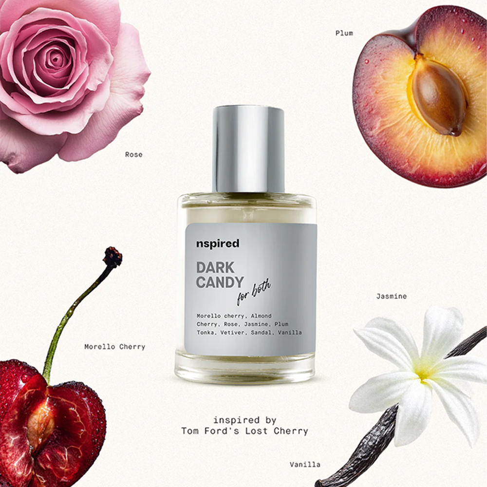 Indulge in the sweetness of Dark Candy—a bold, decadent fragrance inspired by Tom Ford’s Lost Cherry. It opens with the deep allure of morello cherry and bitter almond, setting the stage for a heart of lush Turkish rose, jasmine, and juicy plum. As it lingers, warm notes of vanilla, sandalwood, and tonka bean melt into your skin, leaving a sensual, intoxicating trail that’s both provocative and addictive.