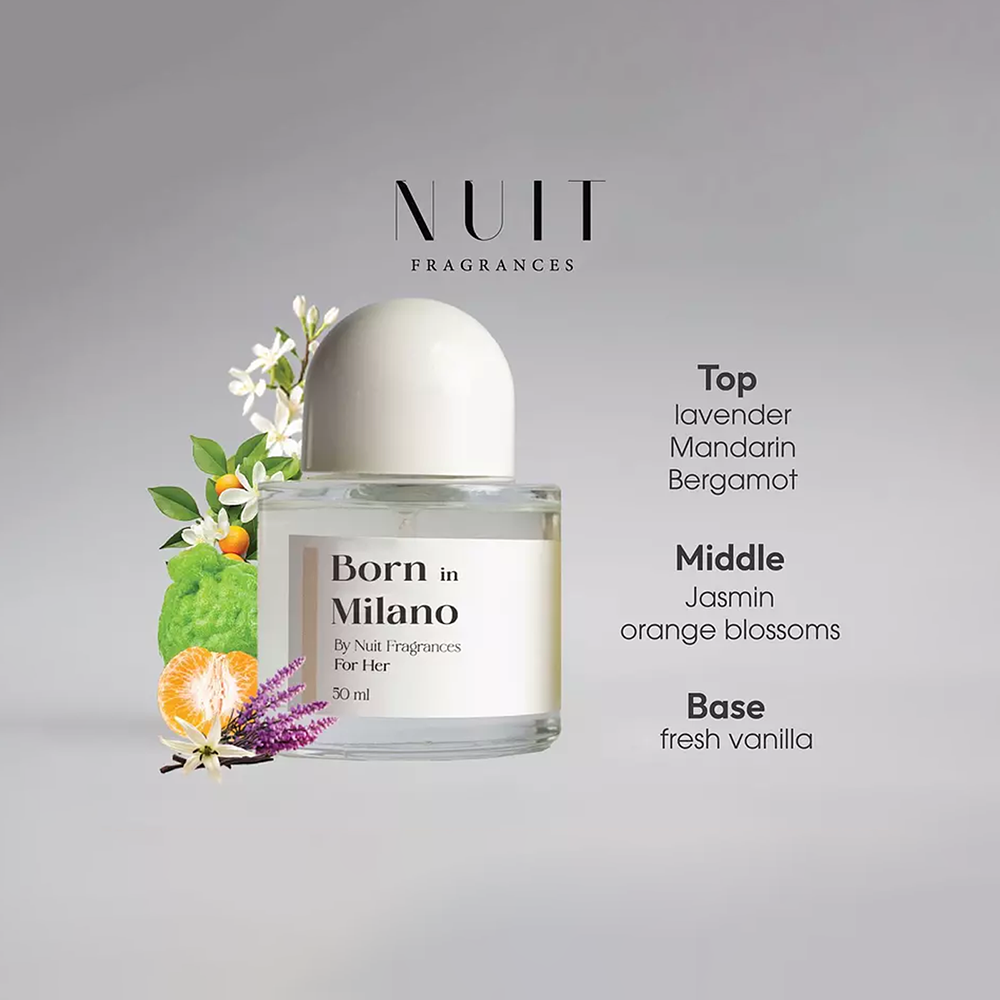 Embrace the essence of summer with Born In Milano from Nuit Fragrances. This fragrance blends lavender, orange blossom, and vanilla to evoke a sense of elegance and empowerment, making it the perfect choice for those who wish to make a memorable impression.