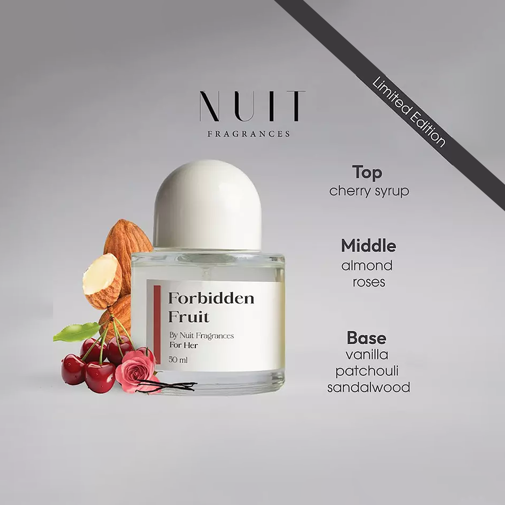 Immerse yourself in the alluring fragrance of Forbidden Fruit from Nuit Fragrances. It begins with a sweet, candied cherry syrup that captures attention and evolves into a clean blend of almond and soapy notes as it dries down. This scent unfolds with layers of complexity, leaving a lasting impression.