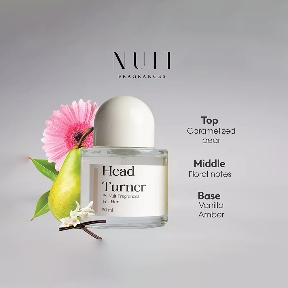 Indulge in a sweet and alluring scent with Head Turner Perfume from Nuit Fragrances. The rich aroma of caramelized pear harmonizes with creamy vanilla and warm amber, creating a fragrance that is both unforgettable and enticing.