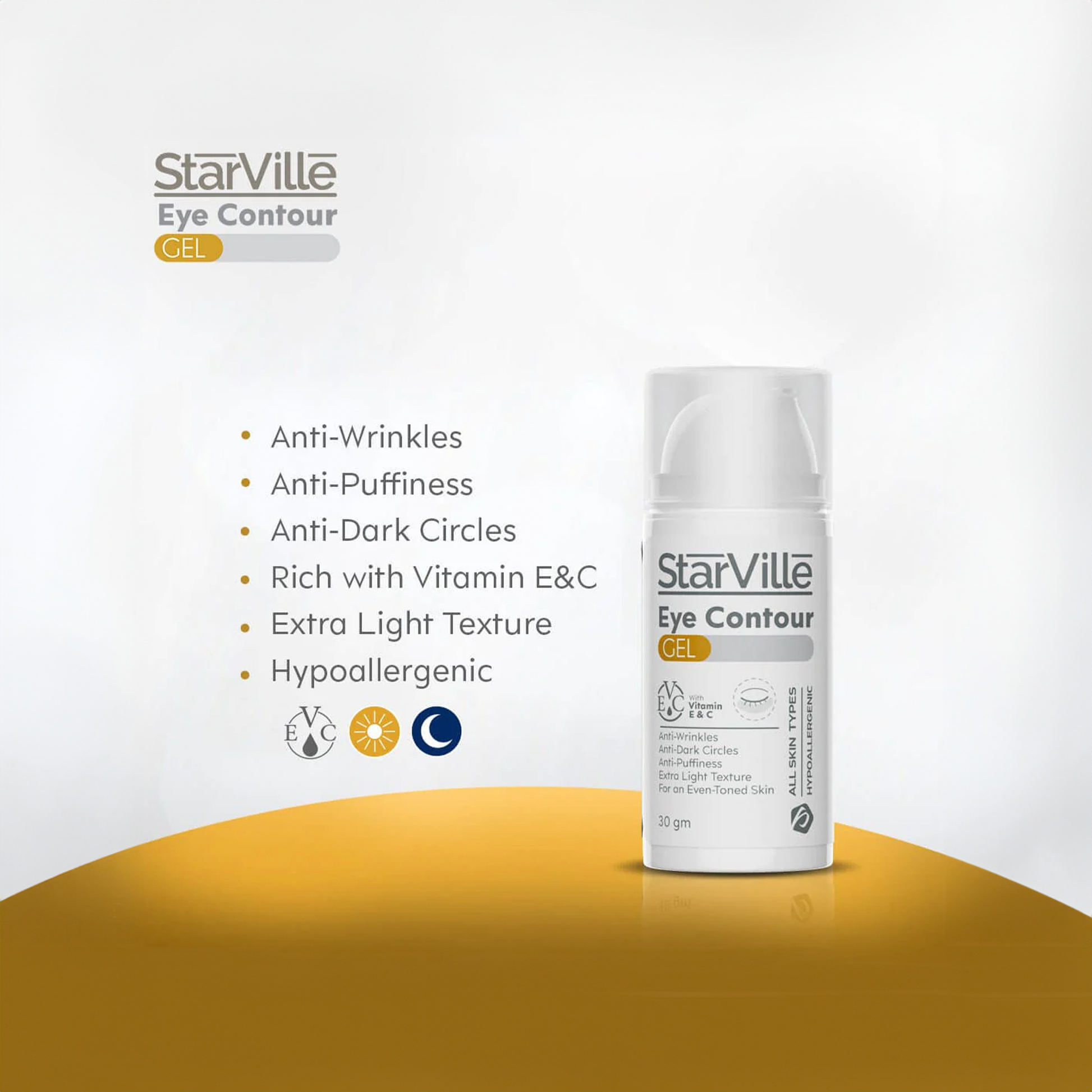 Elevate your skincare routine with This Eye Contour Cream from StarVille and experience revitalized, youthful-looking eyes. A special formula designed to to address multiple concerns and enhance the delicate skin around your eyes. It helps to prevent puffiness and reduces bags under the eyes, providing anti-wrinkle action to minimize the appearance of fine lines. With daily use, it offers deep soothing and hydration to the eye contour area, while also helping to reduce dark spots and remove dark circles for a refreshed appearance. Enriched with essential vitamins, it nourishes your skin, promoting a healthy, glowing, and natural look.