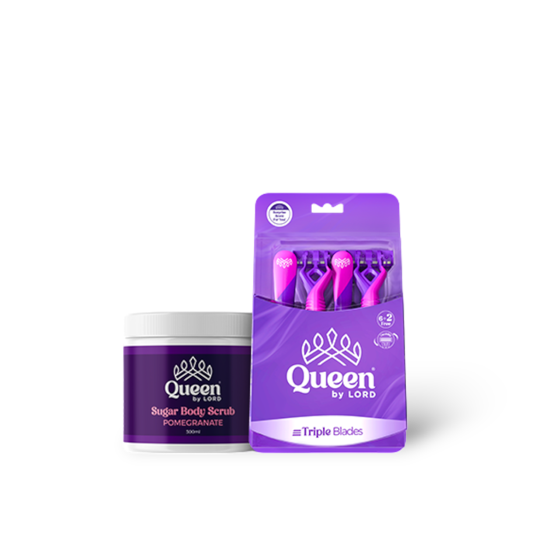 Pamper your skin with Queen by Lord's Pomegranate Perfection Kit. Exfoliate and refresh with the invigorating pomegranate body scrub, then achieve a close, smooth shave with our triple-blade scented razors. This perfect pairing provides everything you need for smooth, glowing skin.