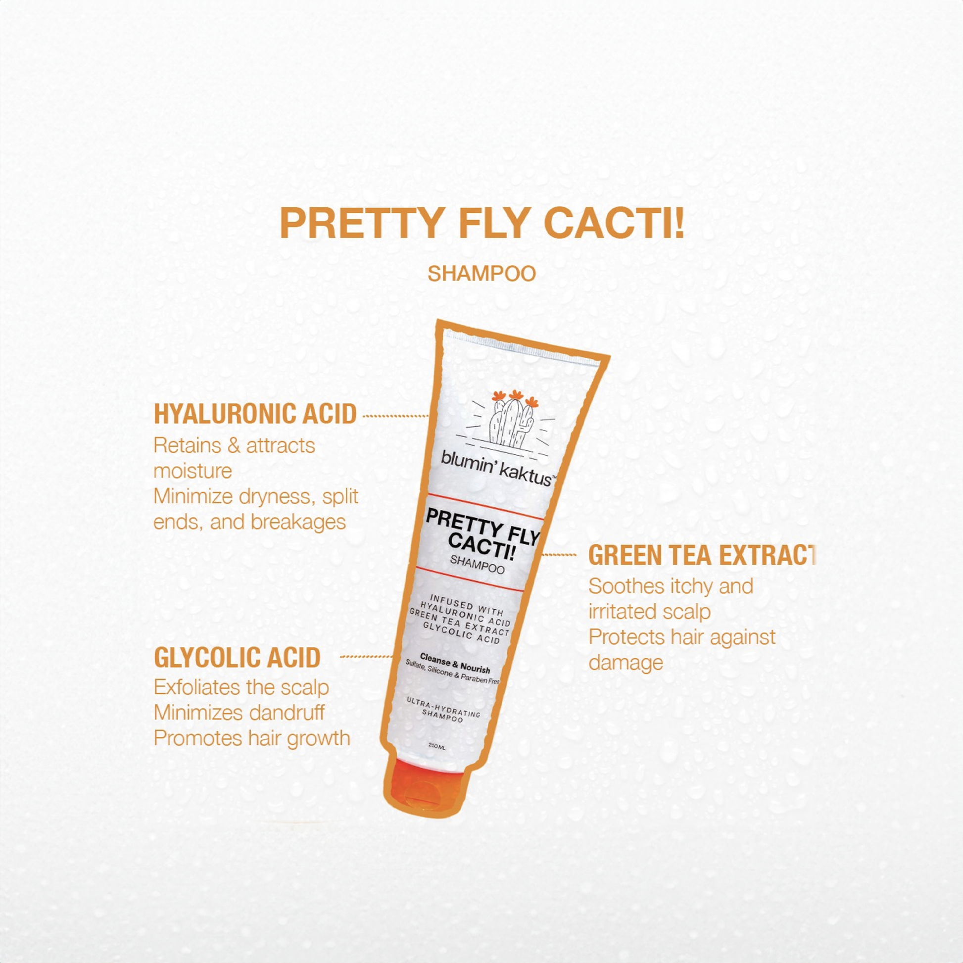 Revitalize your hair with Blumin Kaktus Pretty Fly Cacti Shampoo. Infused with a potent blend of Hyaluronic Acid, Green Tea Extract, and Glycolic Acid, this formula deeply cleanses and nourishes, transforming dry, brittle hair into silky smooth locks. Say hello to revitalized, luscious hair as you embrace the Pretty Fly Cacti experience!