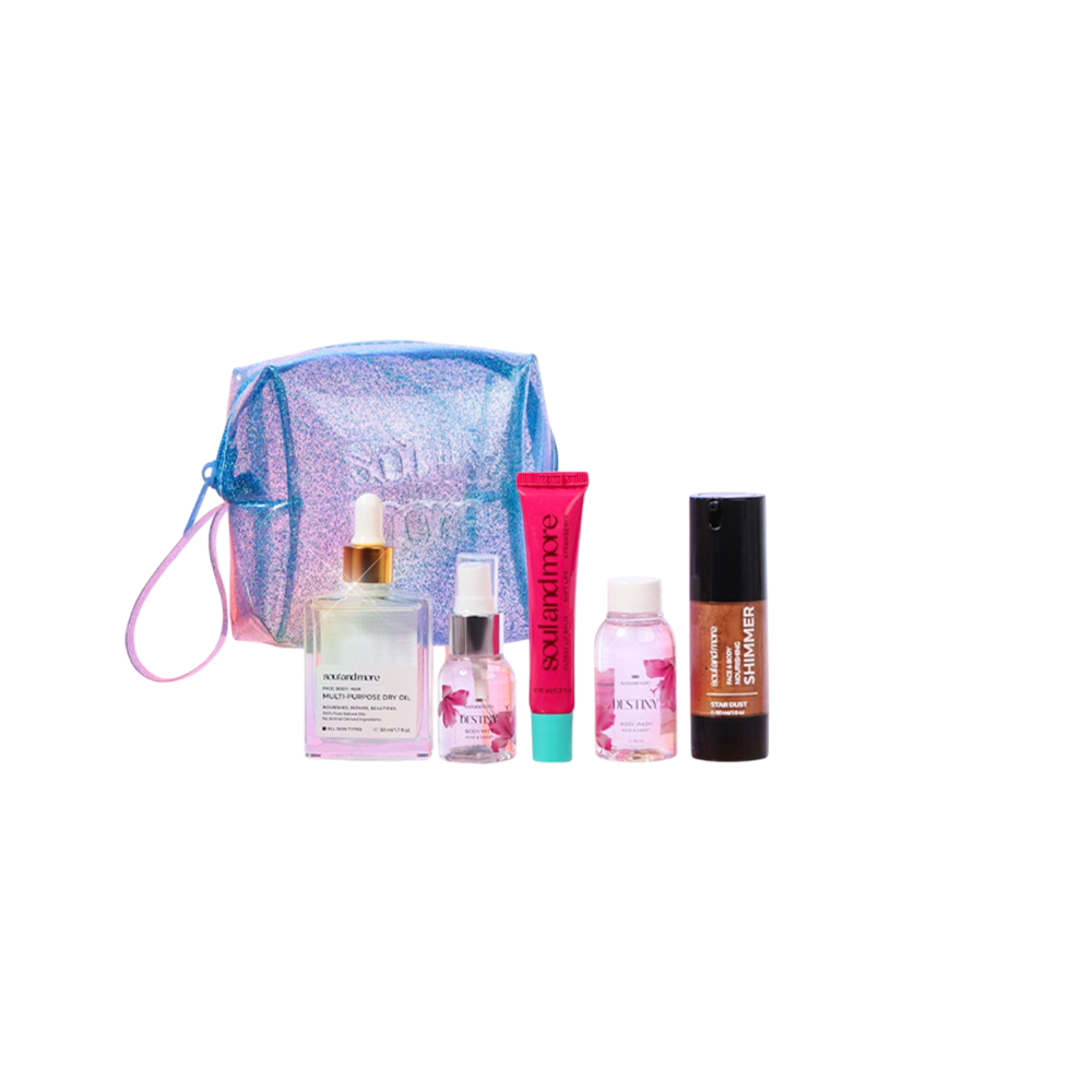 Keep your essentials chic and travel-ready with Soul & More’s The Blue Pouch. This compact bundle pairs mini fragrance, cleansing, and glow essentials with a full-size dry oil for a polished, on-the-go routine.