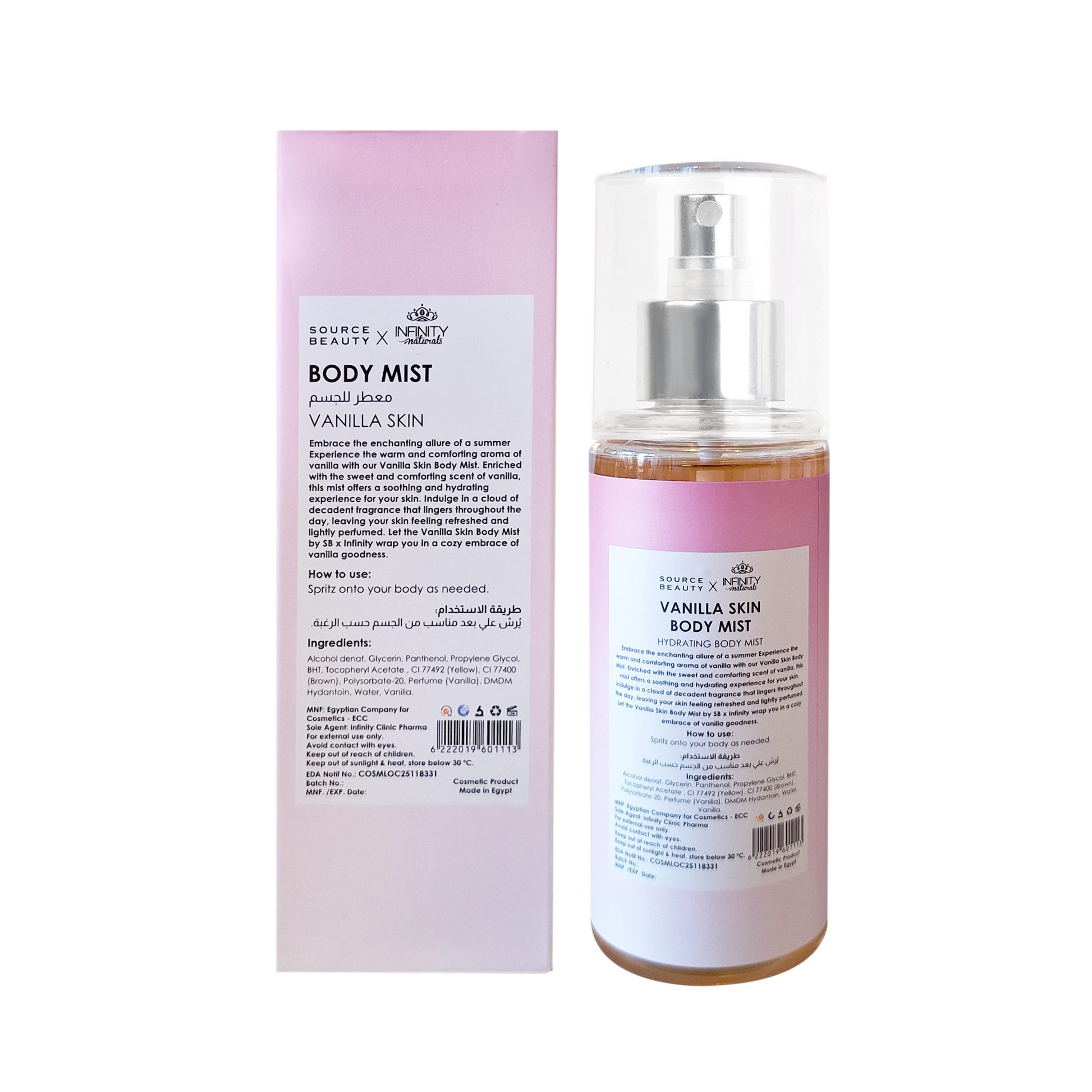 Experience the warm and comforting aroma of vanilla with our Vanilla Skin Body Mist. Enriched with the sweet and comforting scent of vanilla, this mist offers a soothing and hydrating experience for your skin. Indulge in a cloud of decadent fragrance that lingers throughout the day, leaving your skin feeling refreshed and lightly perfumed. Let the Vanilla Skin Body Mist by SB x Infinity wrap you in a cozy embrace of vanilla goodness.