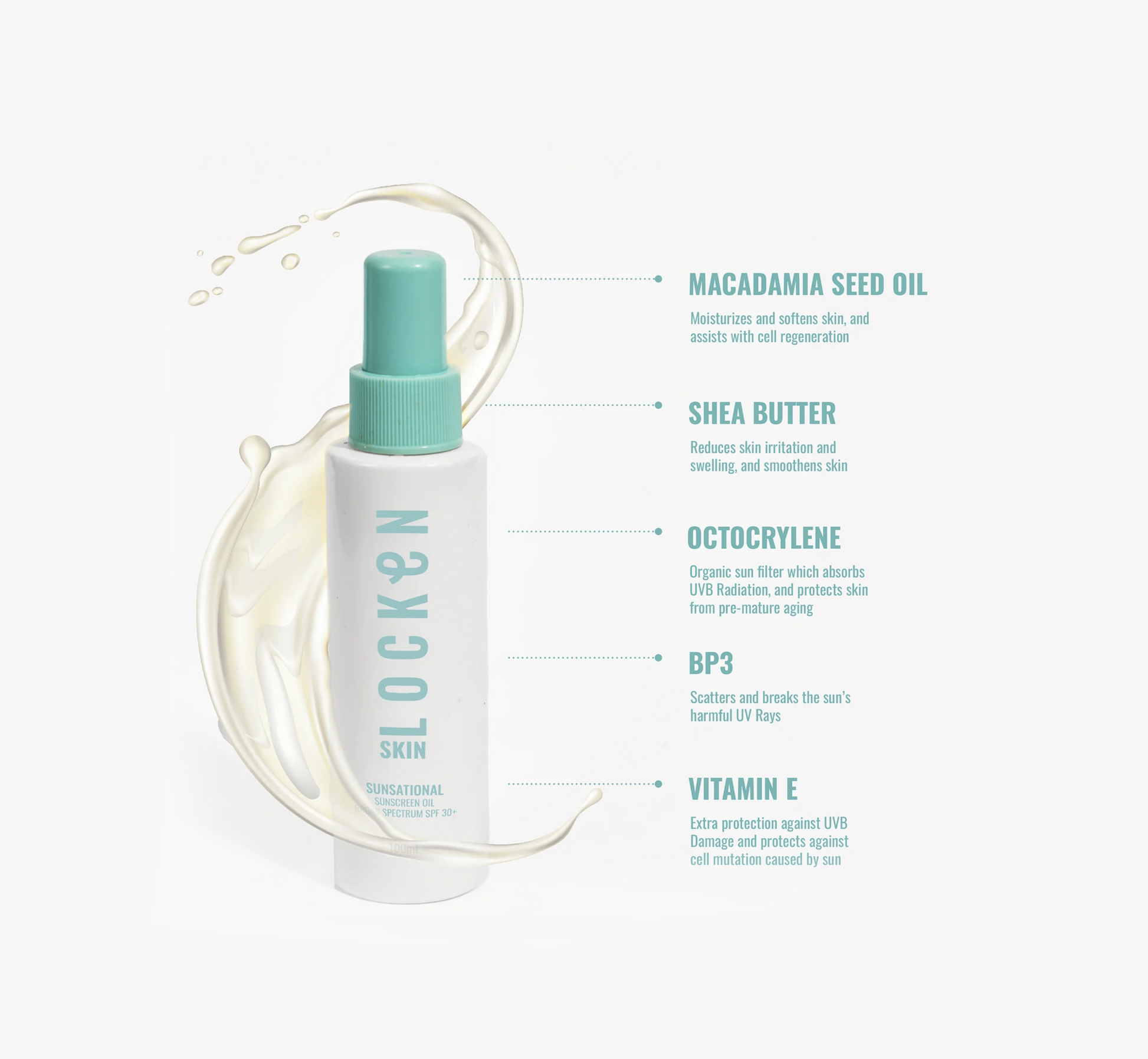 Introducing the ultimate sunscreen power: Locken's Sunsational SPF 30+ Sunscreen Oil. Infused with natural oils, butters, and vitamins, this broad-spectrum sunscreen oil provides your skin with the perfect balance of protection and hydration. Its nourishing formula helps to keep your skin looking healthy and moisturized while providing the protection you need to stay safe in the sun. With its natural ingredients, you can trust that this sunscreen oil will keep your skin safe from the sun's harsh rays. Get the ultimate protection, with the ultimate sunscreen power!