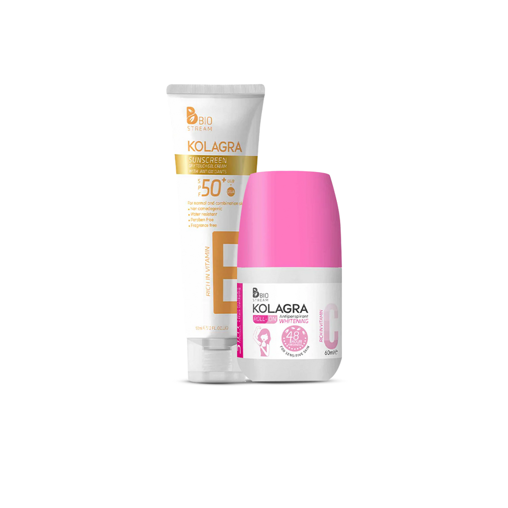 Introducing the Kolagra Sun Secret Kit, which includes two essential items: Sunscreen & Deodorant.